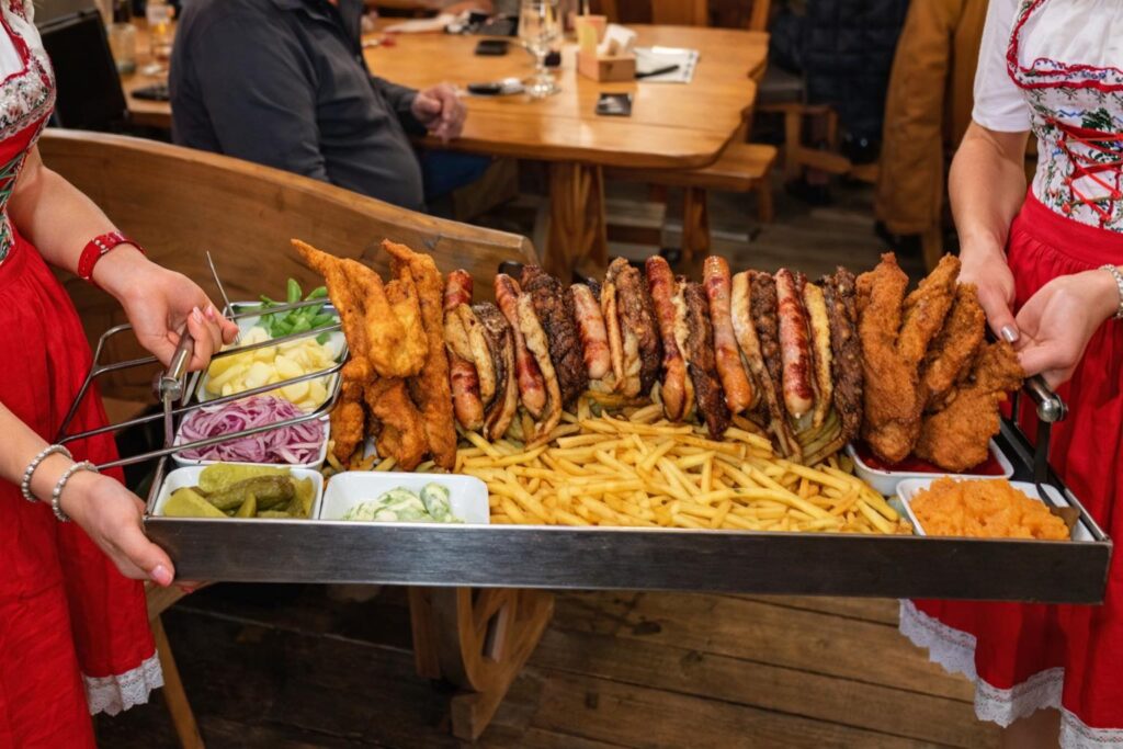 Bergbauern Platte (Schweinsbraten, Bauern geselchtes gebackener Blutwurst, Grillwürstel Spareribs – für 10-12 Personen inklusive Beilagen (Knödel Bratkartoffel Sauerkraut braten Saft Kartoffelsalat Gurkensalat und Krautsalat)