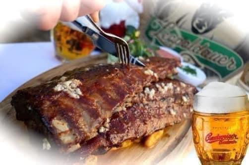 env. 1100 g avec des quartiers de pommes de terre, des sauces et des oignons servis sur une planche (A,C,G)