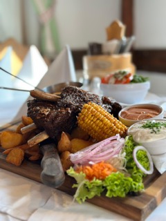 Herrlich zarte sous Vide gegarte Ribs vom Grill, zwischen 700 und 900g je wie gewachsen mit „Bergkäse“ überbacken. Dazu Wedges, gegrillter Mais Kolben, Knoblauch- und Cocktailsauce (A,C,G)