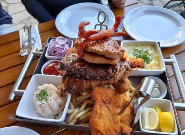 für 2 Personen mit allerlei gebackenem und gegrilltem, dazu Erdäpfelsalat, Pommes, Reis, Kräuterbutter & Saucen (A,C,G,O)