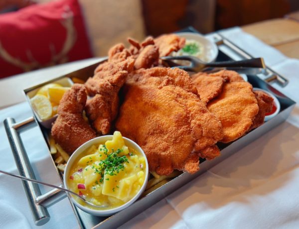 1/2 frischen Backhendl, Hühner Schnitzerl, Hühner Cordon Bleu, Reis, Erdäpfelsalat, Pommes (A, C, G, O)