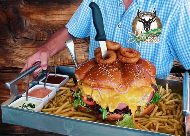 „BIG PAPAS BURGER“ – mit 2x 1500g reinstes BEEF extra für uns angefertigt (70/30% Fleisch-Fett Anteil Mischung) gefüllt ist der Burger mit Cheddar Käse & geräuchertem Selch-Speck , Tomaten, Gurken Salat Zwiebel dazu gibt es ca. 2,5kg Pommes, gebackene Zwiebelringe Saucen – Käse Sauce, Knoblauch Sauce, BBQ, Sauce Sweet Chilli Sauce reicht für 8-10 Personen