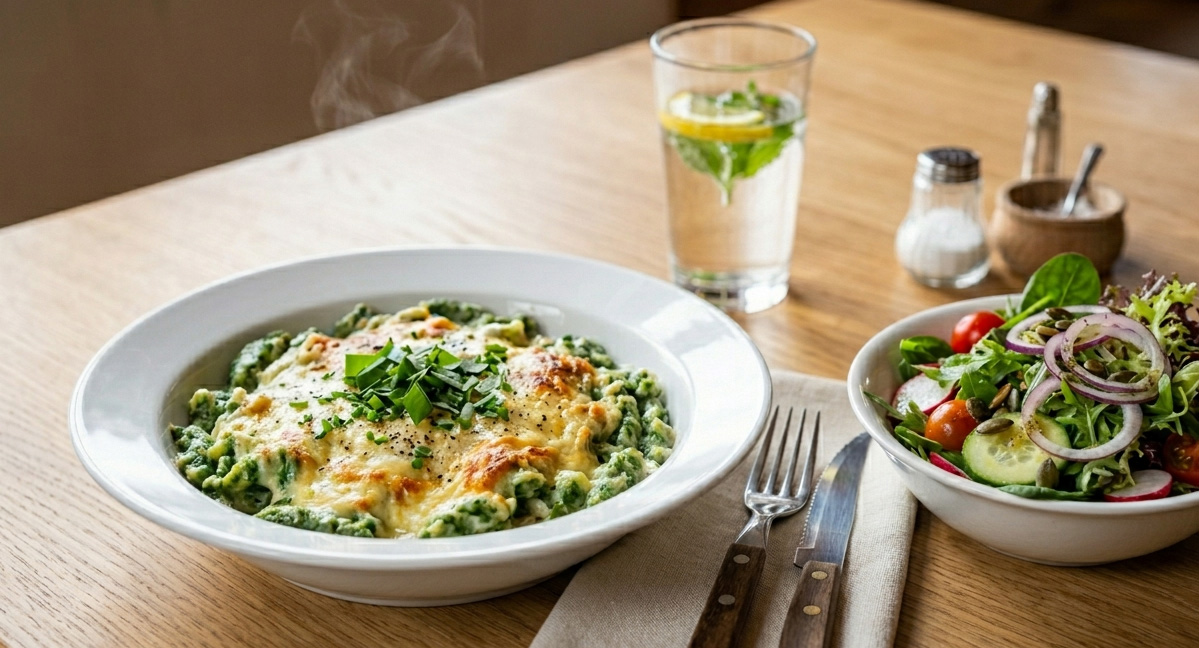 gefüllt mit Schinken,Käse und frischen Bärlauch dazu Pommes oder Erdäpfelsalat (A,C,G,N,F,P)