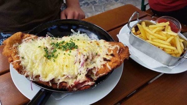 vom Schwein gefüllt mit Schinken, Käse, in der Pfanne mit Bergkäse, Speck & Zwiebel überbacken, dazu eine Beilage deiner Wahl* (A,C,G)