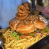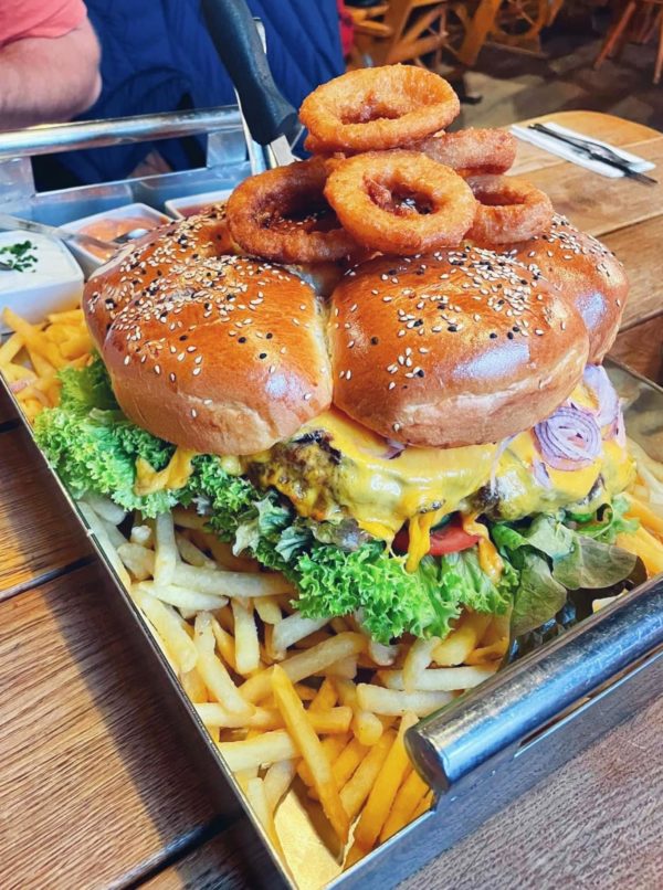 der größte Burger Österreichs, ca. 1,5kg reines 100% Beef Patty, gratiniert mit Cheddarkäse & geselchtem Speck, gefüllt mit Tomaten, Gurken, knackigem Salat, rotem Zwiebel, dazu Pommes, Saucen und Zwiebelringe
